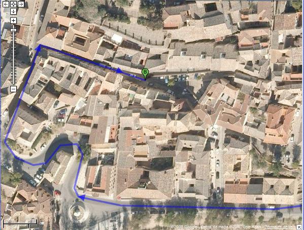 Como se ve en el plano se trata de seguir el curso del río dejándolo siempre a la izquierda hasta donde se puede y entonces llegamos a una rotonda con una gran columna donde giramos a la derecha y tras pasar la serpenteante cuesta, la segunda a la derecha (Calle de San Cipriano) que desemboca en la Plaza de San Cipriano. Detalle de llegada a destino: